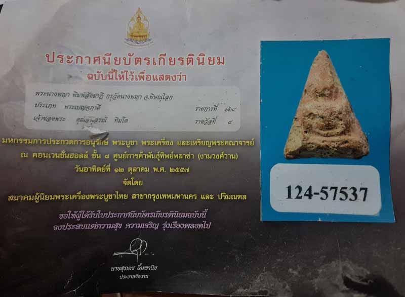 พระกำแพงงบน้ำอ้อยพิมพ์พระเจ้าห้าพระองค์ กำแพงเพชร บัตรการันตี |