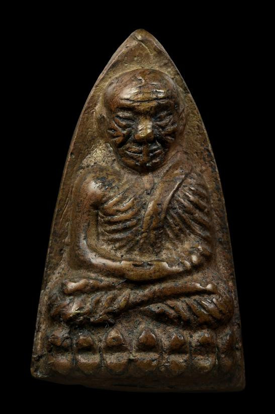 หลวงปู่ทวด พิมพ์เตารีดปรกโพธิ์หลังตัวหนังสือ วัดมหาธาตุ เขตพระนคร กรุงเทพฯ ปี พ.ศ.2505 พิมพ์เล็ก (หรือ พิมพ์จิ๋ว) เนื้อทองเหลือง |