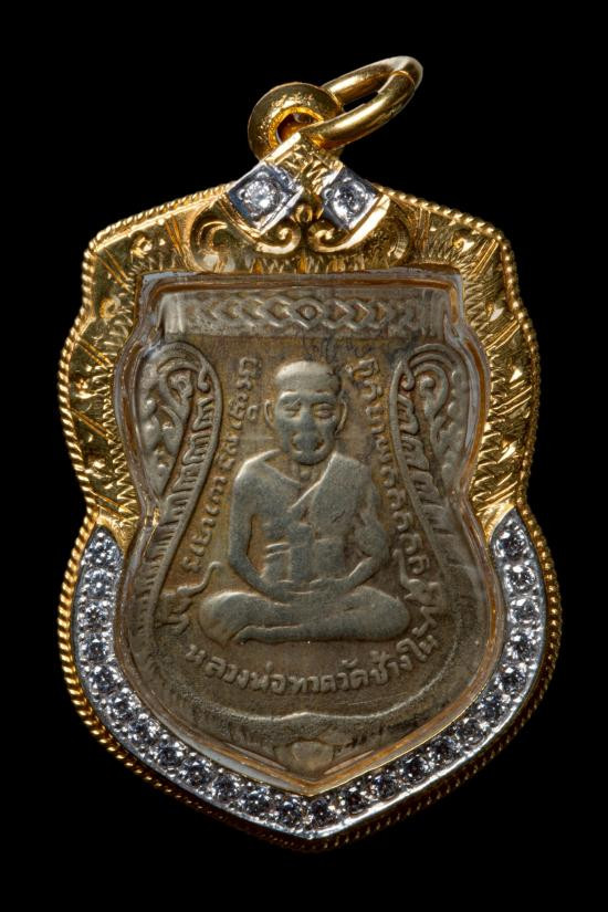 หลวงปู่ทวด วัดช้างให้ รุ่นกฐิน 42 พิมพ์เบตงเลขใต้ฐาน เนื้อเงิน ปี 2542 จ.ปัตตานี พร้อมเลี่ยมกรอบทองคำ จำนวนสร้าง 99 องค์ |