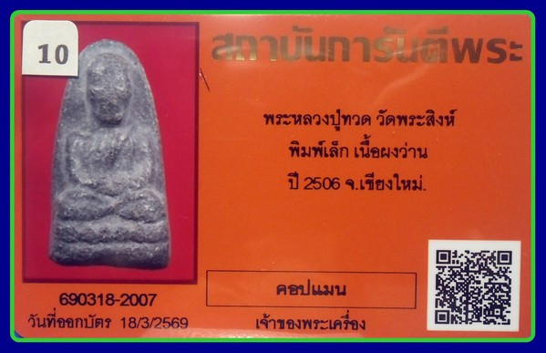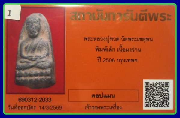 บัตรการันตี -800- หลวงปู่ทวด วัดพระเชตุพนฯ (วัดโพธิ์ ท่าเตียน) เนื้อผงว่าน พิมพเล็ก พศ.2506 กรุงเทพฯ |
