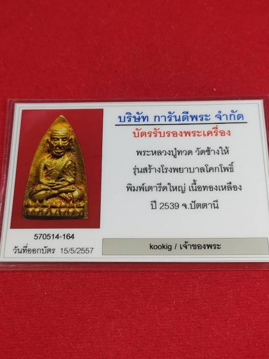 หลวงปู่ทวด วัดช้างให้ รุ่นสร้างโรงพยาบาลโคกโพธิ์ ปี 2539 พิมพ์เตารีดกลาง เนื้อทองทิพย์ พร้อมกล่องเดิม |