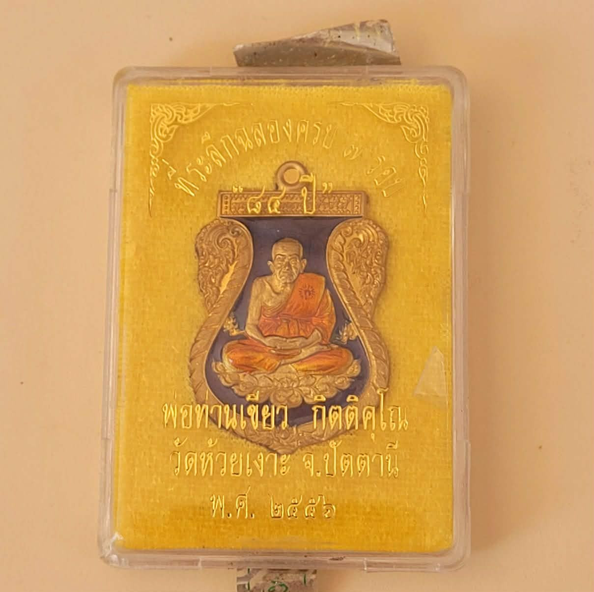 เคาะแรก+++เหรียญหลวงพ่อทวด ที่ระลึกฉลองครบ 7 รอบ "84 ปี" พิมพ์เสมา เนื้อทองทิพย์ลงยาน้ำเงิน จีวรเหลือง พ่อท่านเขียว กิตติคุโณ วัดห้วยเงาะ จ.ปัตตานี พ.ศ. 2556 หมายเลข 58 |