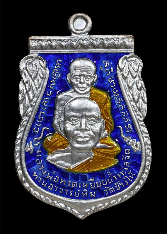 หลวงพ่อทวด หลวงพ่อทอง วัดสำเภาเชย รุ่นแซยิด 93 เหรียญพุทธซ้อน พิมพ์กรรมการใหญ่ เนื้อเงินลงยา พื้นน้ำเงิน จีวรเหลือง |