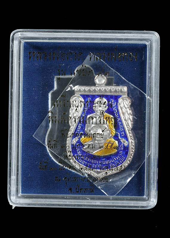 หลวงพ่อทวด วัดช้างให้ รุ่นพิพิธภัณฑ์ ปี 2558 พิมพ์พุทธซ้อน เนื้อเงินลงยาสีเหลือง หมายเลข ๑๘๓๗ มาพร้อมกล่องครบชุด ( เหรียญจริงสวยครับ ) |