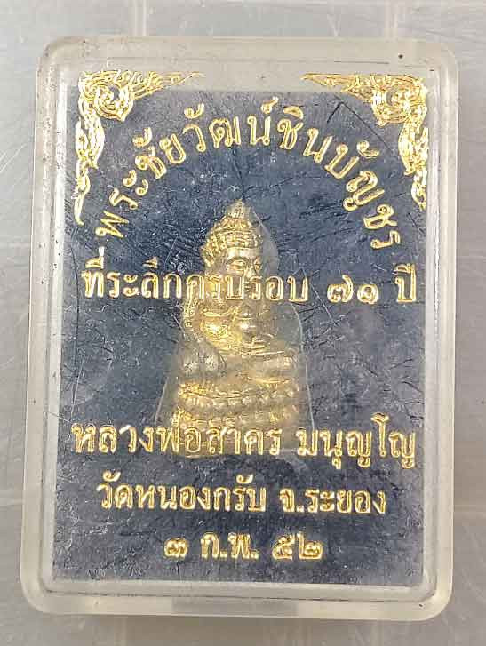 พระชัยวัฒน์ชินบัญชร เนื้อทองเหลือง โค๊ตเลข 9 ปี 52 หลวงพ่อสาคร วัดหนองกรับ เลี่ยมพร้อมใช้ |