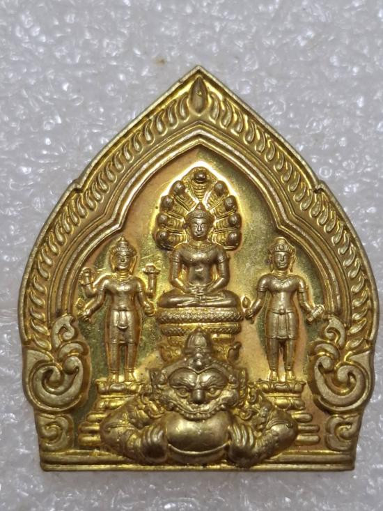 พระนารายณ์ทรงครุฑประทับพระราหู ปี48 เจ้าคุณธงชัย วัดไตรมิตรวิทยาราม เนื้อผงปิดทองบางส่วน ฝังยันต์ดวง พิมพ์ใหญ่ |