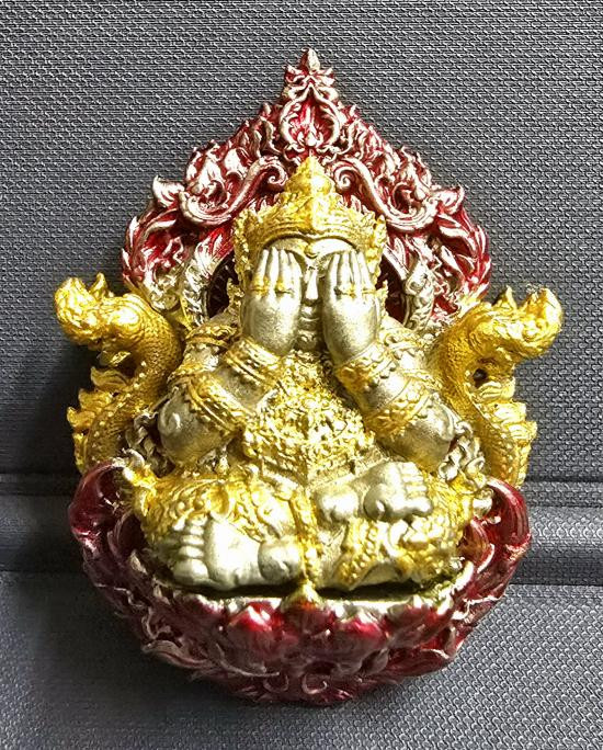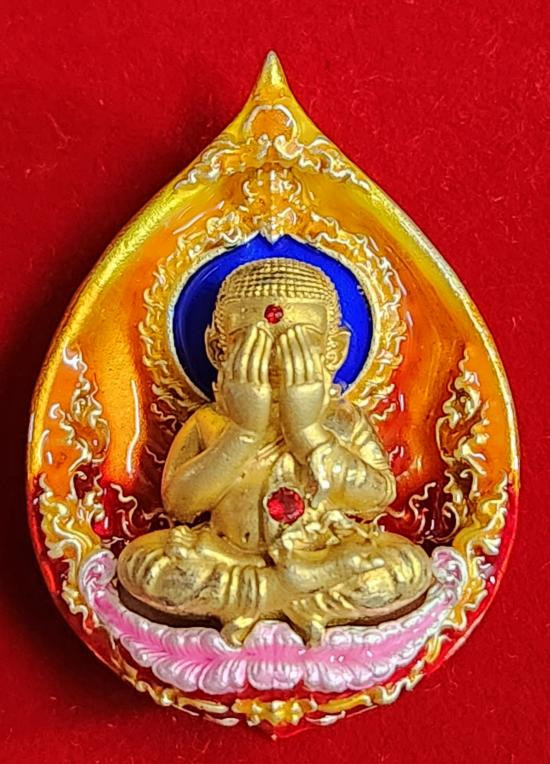 พระปิดตาพุทธศิลป์ รุ่นเจริญพร หลวงปู่โต๊ะ อินทสุวัณโณ วัดถ้ำสิงโตทอง เนื้อชุบเงิน ลงยาลายพระอาทิตย์อัสดงหน้า-หลัง องค์ทอง ฝังพลอยแดงหน้าผาก,สะดือ สร้างเพียง 29องค์(รันเลขรวม) |