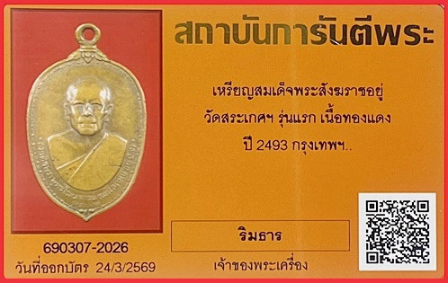เหรียญสมเด็จพระสังฆราชอยู่ วัดสระเกศฯ รุ่นแรก ปี2493 มีบัตรรับรองจีพระ เคาะเดียว |
