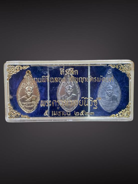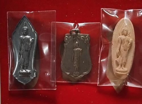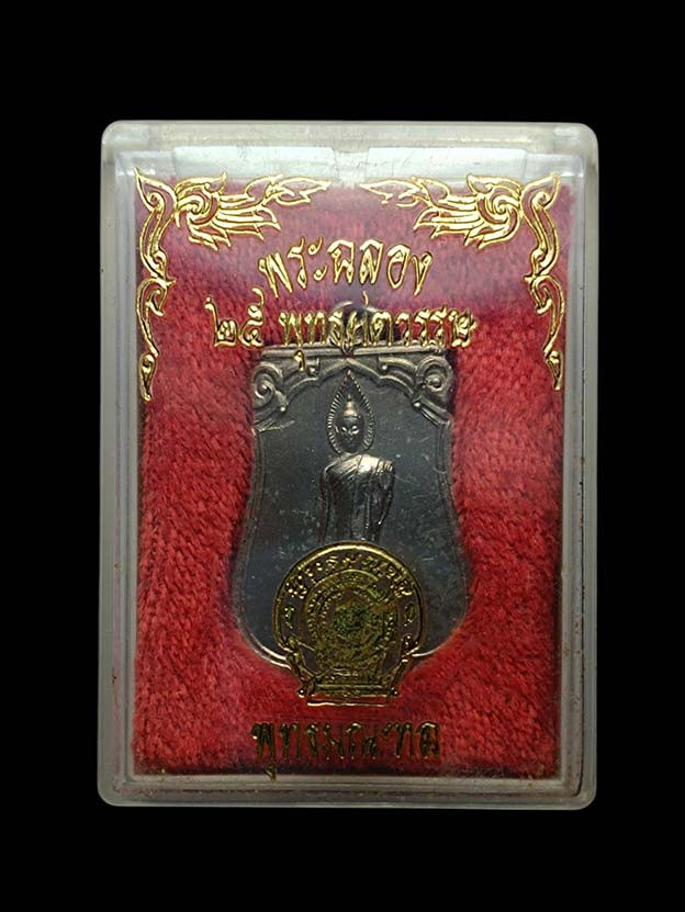 พระพุทธลีลา 25 พุทธศตวรรษ (ครบชุด 3 องค์) ปี 2500 พิธีใหญ่มาก พร้อมกล่องเดิมและใลฝอย |