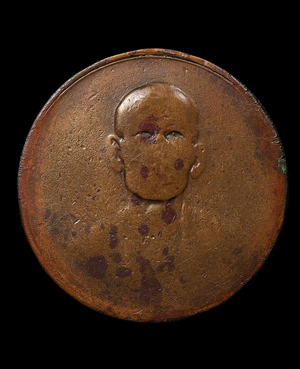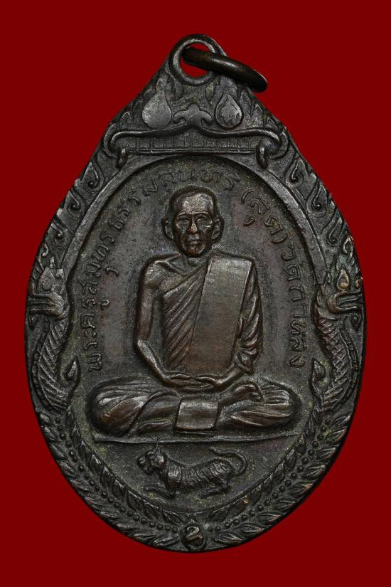 เหรียญหน้าบัน หลวงพ่อมุม วัดปราสาทเยอร์ เนื้อทองเเดงรมดำ ปี 2515 จ.ศรีสะเกษ |
