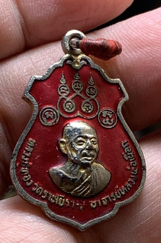 เหรียญลงยาสีแดง กะหลั่ยทอง เหรียญหลวงพ่อทอง วัดราชโยธา หลังหลวงปู่เผือก 2520 |