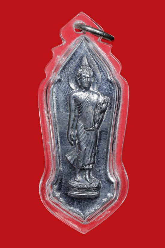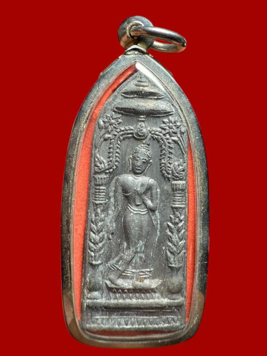 พระลีลากำแพงนิ้วซุ้มฉัตร เนื้อชิน หลวงพ่อขอม วัดไผ่โรงวัว ปี 2505 |