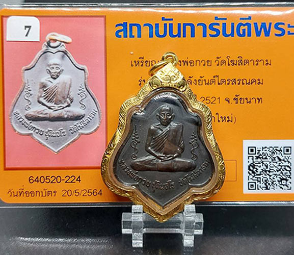 เหรียญหลวงพ่อกวย วัดโฆสิตราม รุ่น3 หลังยันต์ไตรสรณคม (รมดำ) ปี 2521 พร้อมกรอบทอง |