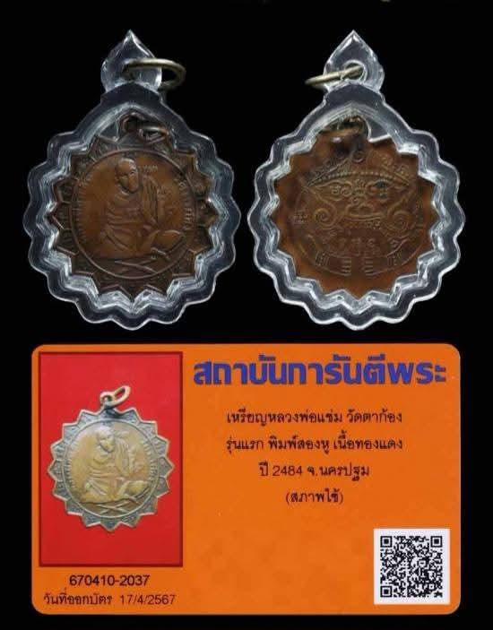 เหรียญรุ่นแรก(พิมพ์สองหู) หลวงพ่อแช่ม วัดตาก้อง ปี2484 นครปฐม @ พร้อมบัตรรับรอง@ |