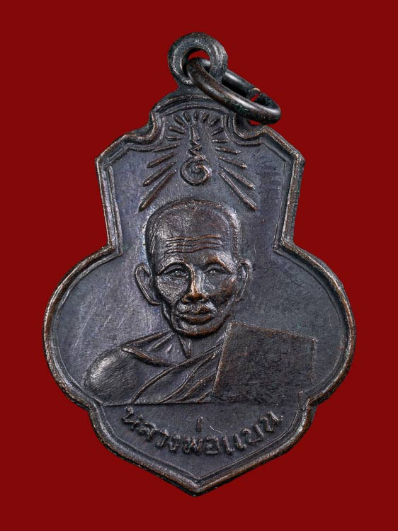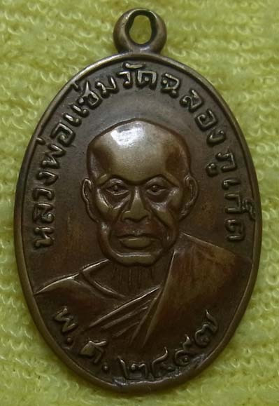 เหรียญหลวงพ่อแช่ม วัดฉลอง จ.ภูเก็ต พิมพ์เส้นคอเล็กหลังยันต์ เนื้อทองแดง ปี 2497 พร้อมบัตรรับรอง |