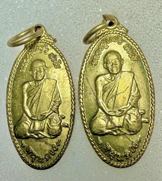 เหรียญหลวงปู่แผ้ว รุ่นใบขี้เหล็กหนุนดวง ปี ๒๕๕๑ เนื้อทองฝาบาตร พิมพ์เล็ก สภาพสวย 2เหรียญ |