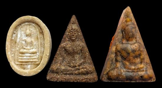 พระสมเด็จพิมพ์จันทร์ลอย เนื้อผงน้ำมัน + พระนางพญาไตรมาส ปี29 + นางพญาหลังจีวรปั๊มเสือเผ่น ปี39 หลวงพ่อเปิ่น วัดบางพระ |