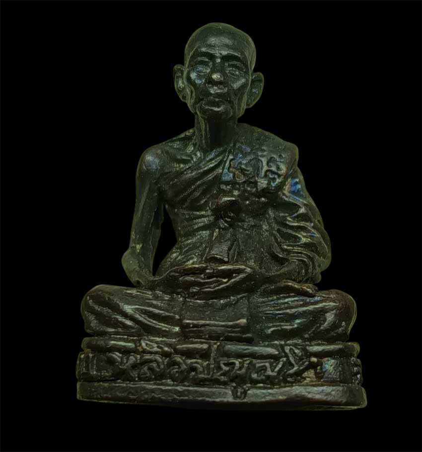 รูปหล่อ พระพุทธเจ้าเปิดโลก หลวงปู่หลิว วัดไร่แตงทอง เนื้อทองเหลืองรมดำ ปี 2539 |
