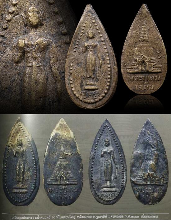 เหรียญหล่อพระร่วงโรจนฤทธิ์ พิมพ์ใบมะยมใหญ่ หลังองค์พระปฐมเจดีย์ มีตัวหนังสือ พ.ศ.2487 เนื้อทองผสม "พระหล่อได้เต็มฟอร์ม เป็นองค์ครูหรือองค์ต้นแบบที่สวยกว่าในหนังสือตามรูป"ได้เลยครับ |
