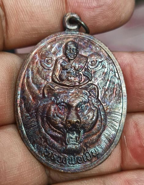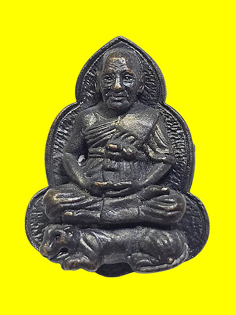 เหรียญหล่อหน้าเสือ (ย้อนยุค-รุ่นแรก) หลวงพ่อน้อย วัดธรรมศาลา ปี พ.ศ. 2534 เนื้อนวะ ตอกโค๊ต "น" กล่องเดิม |