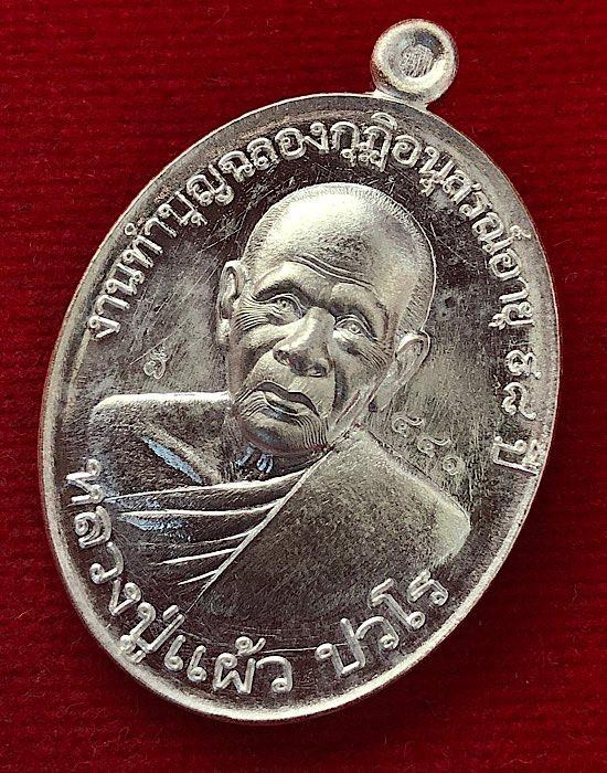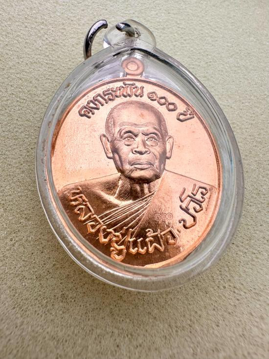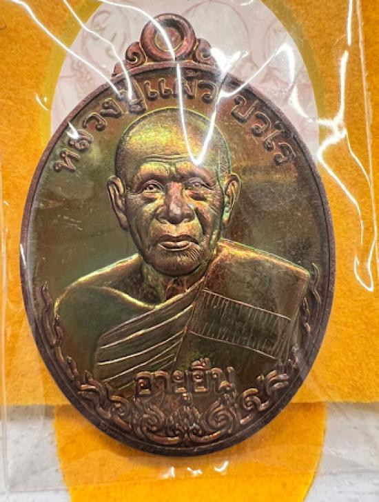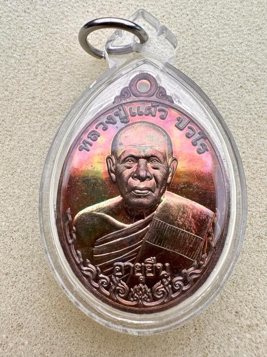 เหรียญหลวงปู่แผ้ว ปวโร เเจกทานบารมี อายุ 99 อายุยืน (เนื้อทองเเดงผิวรุ้ง) วัดรางหมัน |