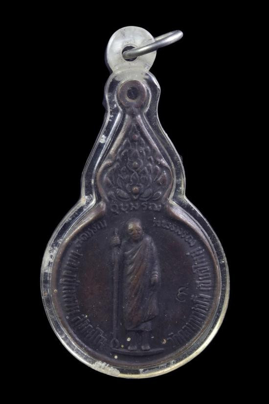 เหรียญยืนถือไม้เท้า รุ่นรวมใจ ( 5 แชะ ) หลวงปู่แหวน วัดดอยแม่ปั๋ง จ.เชียงใหม่ ปี 2518 |