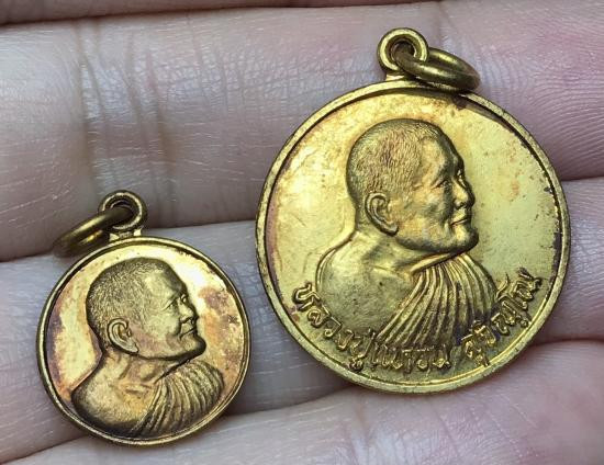 เหรียญฉลองอายุ 98ปี หลวงปู่แหวน หลังดอกบัว ปี 2528 เนื้อทองแดงกะไหล่ทอง พิมพ์ใหญ่และพิมพ์เล็ก ในกล่องกำมะหยี่ (แจกกรรมการ) |