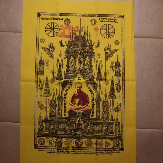 ผืนใหญ่..ขนาด19 X 29 นิ้ว... ผ้ายันต์ครอบจักรวาล 108 หลวงพ่อเกษม รุ่นพุทธคุณ ปี2538 เลข 520 ... 68.12.17 |