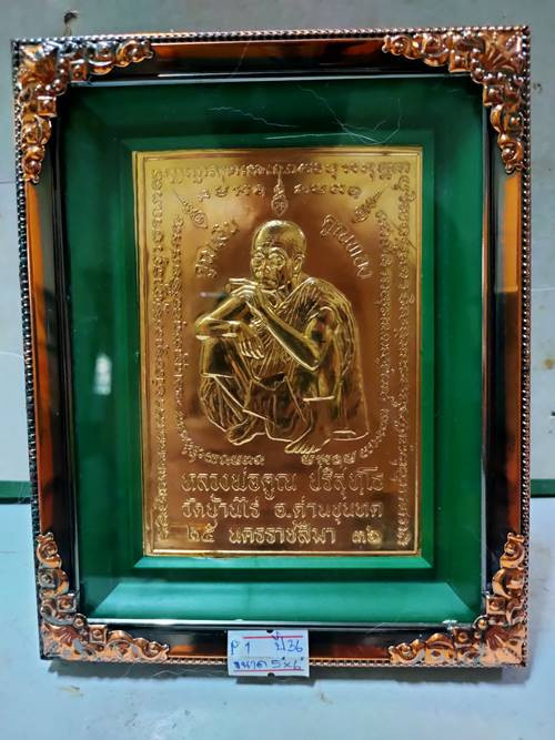 แผ่นกรอบรูปบูชา หลวงพ่อคูณ ปริสุทโธ รุ่น คูณเงินคูณทอง ออกวัดบ้านไร่ ปี 2536 พิมพ์จุดเศก เนื้อ ซิลิก้าทาทอง 5x6นิ้ว เคาะเดียวแดง |