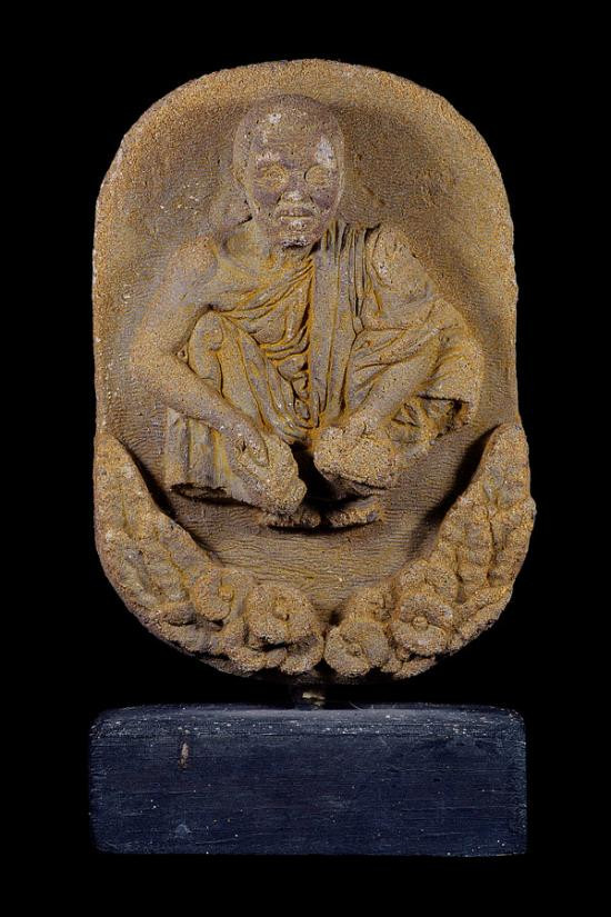 พระบูชาตั้งโต๊ะรูปเหมือนนูนต่ำ ( ฐานไม้ 4 x 2.5 นิ้ว , องค์พระ 6 x 4 นิ้ว , รวมสูง 7.5 นิ้ว ) เนื้อหินทราย ไม่ทราบที่ และ ปีจัดสร้าง |