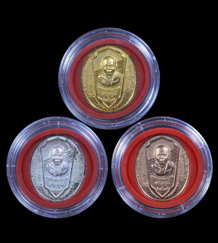 ชุด 3 เหรียญ รุ่น มหาลาภ วปรอ. 399 ( เนื้อกะไหล่พ่นทราย ทอง,เงิน,นาค ) พ.ศ.2539 ( กล่องเดิม ) |