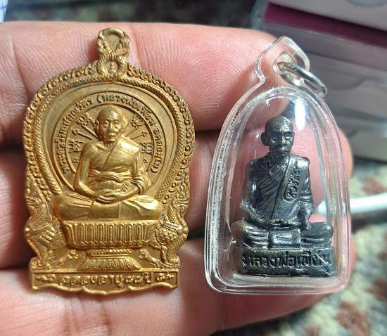 เหรียญนั่งพานหลวงพ่อเพี้ยน + รูปหล่อหลวงพ่อเพี้ยน 2 องค์เลี่ยมพลาสติก 1 องค์ |