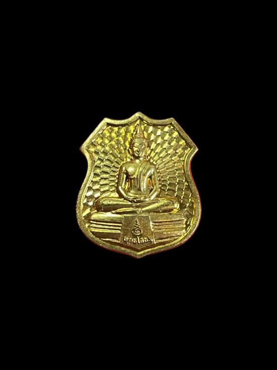 ( เลข 1296 ) เหรียญโล่ห์พระพุทธชินราช หลังยันต์วิเศษอกเลาโภคทรัพย์ เนื้อทองทิพย์ลงยาสีแดง รุ่น สมโภชพระพุทธชินราช ครบ ๖๖๖ ปี |
