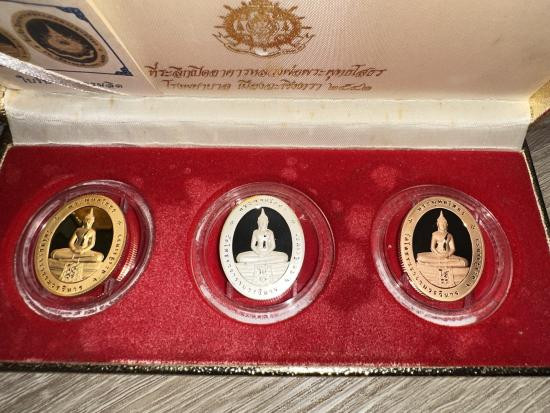 วัดใจแดงแรก เหรียญพระพุทธโสธร ภปร ที่ระลึกเปิดอาคารหลวงพ่อพระพุทธโสธร โรงพยาบาลเมืองฉะเชิงเทรา วัดโสธรวรารามวรวิหาร ปี 2542 สภาพสวยมาก พร้อมกล่องเดิม ชุด 3เหรียญ |