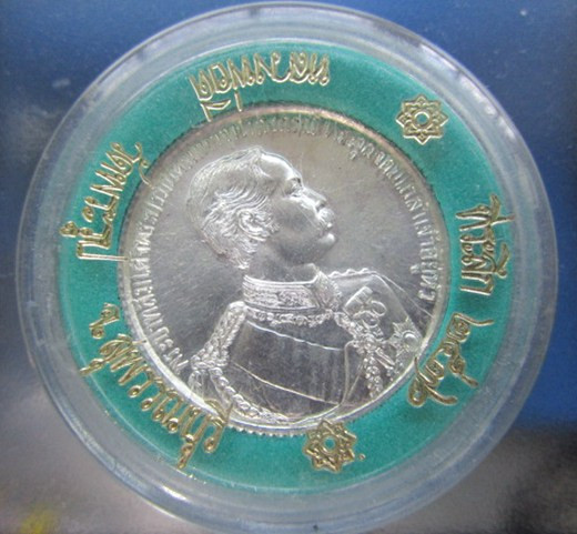 เหรียญ ร.5 ทรงยินดี พระสยามเทวาธิราช เนื้อเงินหน้าทองคำแท้ สร้างโรงพยาบาลพานทอง ปี 2535 (กล่องเดิม) |