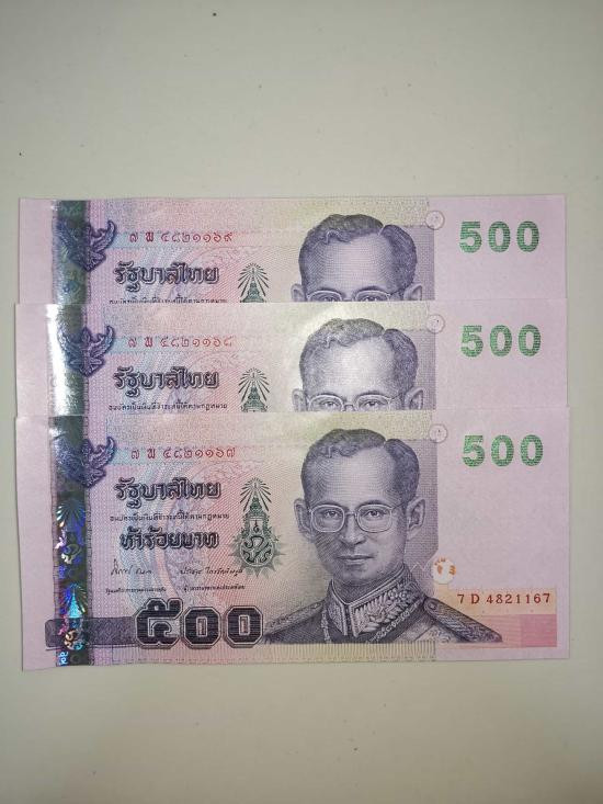 ธนบัตรรักาลที่ 9 ไม่ผ่านการใช้ ฉบับละ 500 บาท รวม 3 ฉบับ ตามรูปเคาะเดียว |