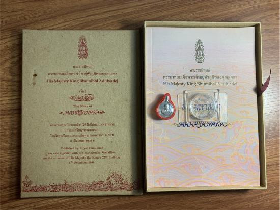 เหรียญพระมหาชนกเนื้อเงินพิมพ์เล็ก พ่อหลวง ร.9 ทรงให้อาจารย์เฉลิมชัยออกแบบ เป็นเครื่องระลึกถึง "วิริยะธรรม" คือความเพียร พร้อมหนังและกล่องใส่เหรียญ |