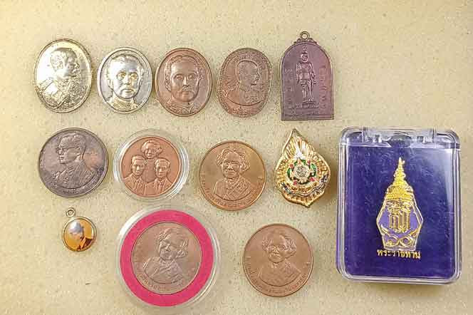 เหรียญร.5 4 เหรียญ + ล็อกเก็ตร.5+ เหรียญร.6 + เหรียญร.9 2 เหรียญ + เหรียญสมเด็จย่า 3 เหรียญ + เข็มกลัดภปร. + เข็มกลัดสธ. |