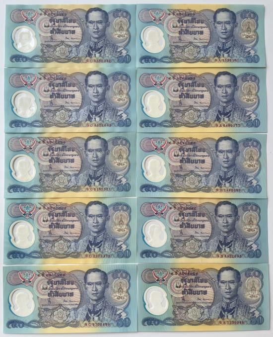 ธนบัตร 50 บาท รัชกาล 9 ลายน้ำสมเด็จย่า จำนวน 10 ใบ ใหม่ 100% เลขเรียง |
