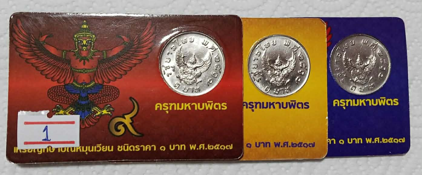 เหรียญ 1 บาท หลังพญาครุฑ เหรียญบาทประสบการณ์ พกติดตัวไว้เป็นมงคล เหรียญสภาพไม่ผ่านการใช้งาน พร้อมการ์ดสีน้ำเงิน,แดง,เหลือง จำนวน 3 เหรียญ |