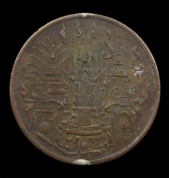 เหรียญรัชกาลที่ 5 ที่ระลึกงานพระเมรุท้องสนามหลวง ร.ศ 119 เนื้อทองแดง ปี 2443 |