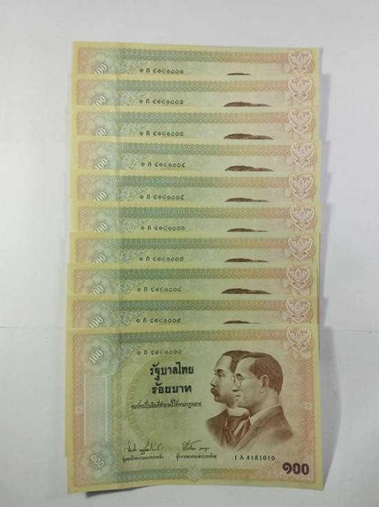 ธนบัตร ๑๐๐ บาท ที่ระลึกเนื่องในโอกาสครบรอบ ๑๐๐ ปีธนบัตรไทย ออกเมื่อ๗ กันยายน ๒๕๔๕ จำนวน ๑๐ ฉบับ |