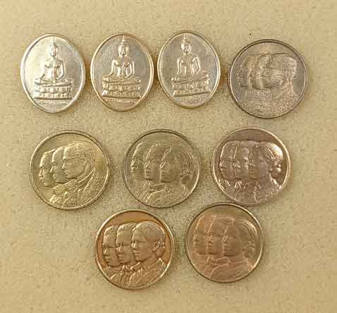 เหรียญร.9 4 เหรียญ + ธนบัตร 10 บาท 3 ฉบับ |