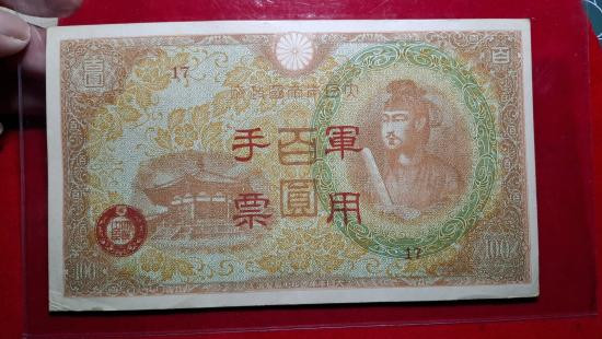 ธนบัตร 100 เยน กองทัพแห่งจักรวรรดิญี่ปุ่น(ในฮ่องกง) ปี ค.ศ.1945 สมัยสงครามโลก |