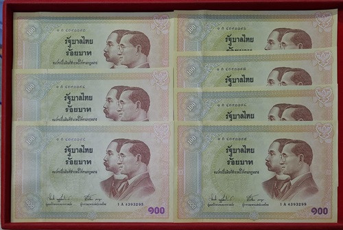 ธนบัตรที่ระลึก 100บาท ร.5+ร.9 ครบรอบ 100ปีธนบัตรไทย สภาพ UNC เลขเรียง 7ฉบับ สภาพสวย |
