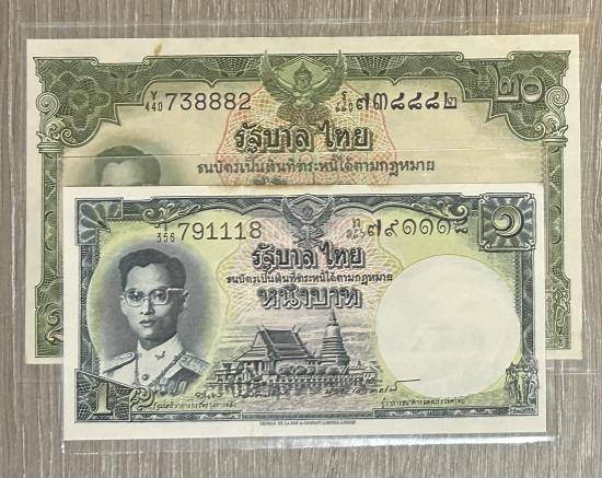ชุดธนบัตร ร.9 โทมัส 2 ใบ ชนิดราคา 20 บาท และ 1 บาท เลขตอง 111 และ 888 ผ่านใช้สวยๆน่าสะสม |