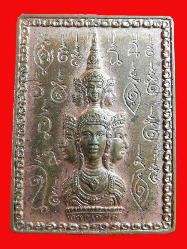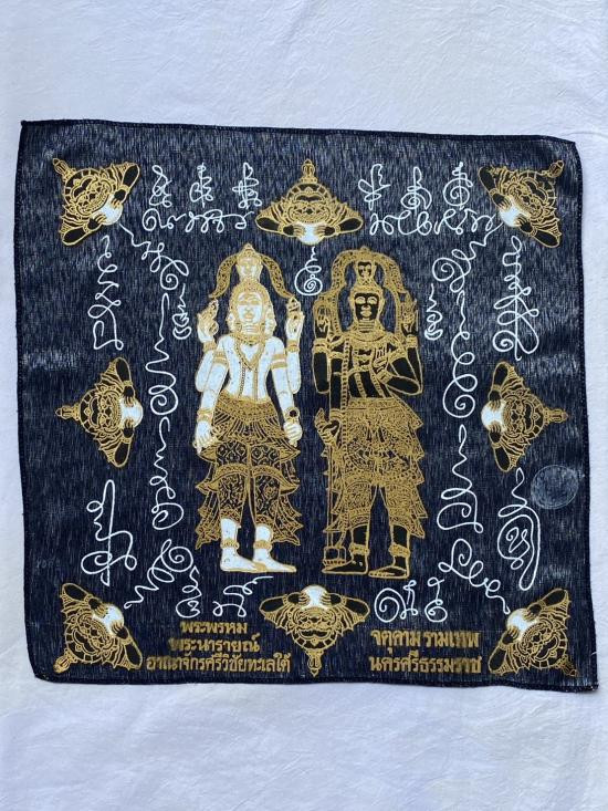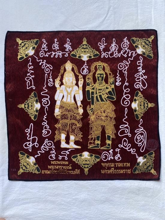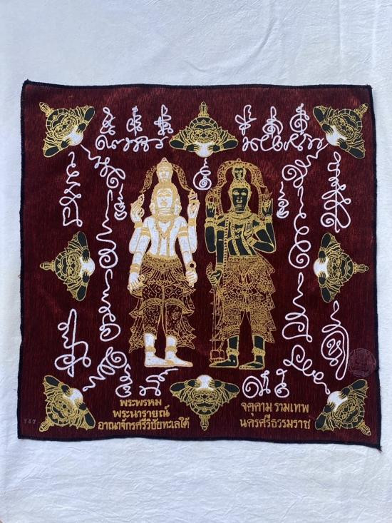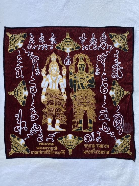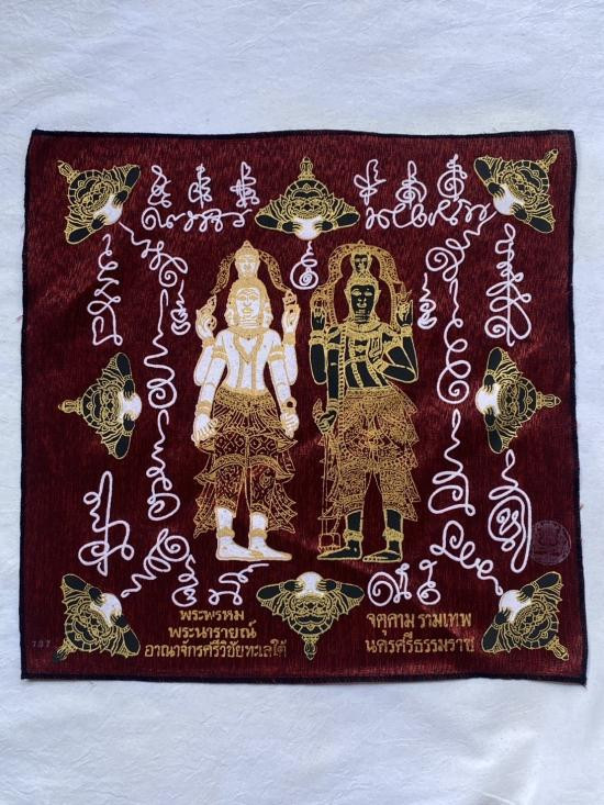 เคาะเดียวแดง ผ้ายันต์ พระพรหม พระนารายณ์ มิ่งมงคล รุ่นมงคลจักวาล ขนาด40/40ซม สีแดง มีตราประทับ-มีรันเลข |