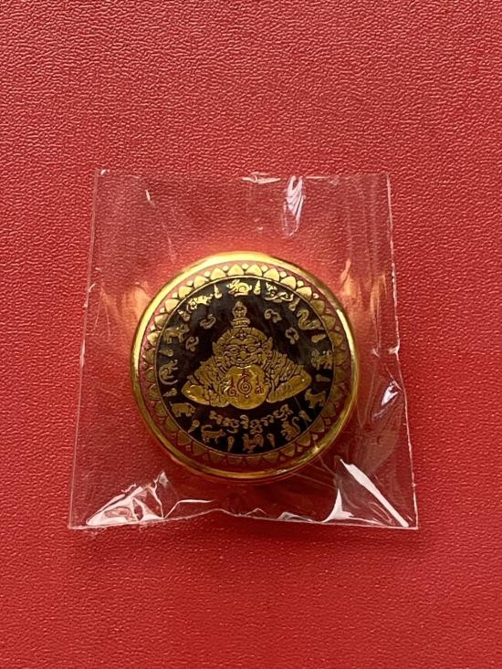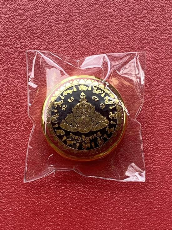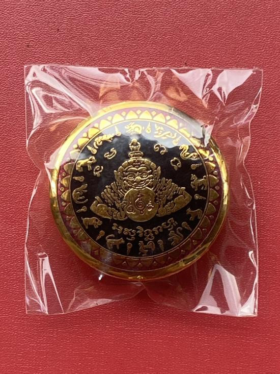เคาะเดียวแดง สีผึ้งพระราหู รุ่น มงคลจักรวาล เนื้อ โลหะชุบทองลงยาดำขอบแดง ขนาด3.2ซม |