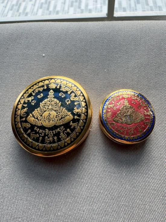 เคาะเดียวไวไว ตลับสีผึ้งพระราหู มหานิยมอุดมโชค จตุคามรามเทพ รุ่น มงคลจักรวาล ปี2549 พิมพ์ใหญ่ ขนาด5.5ซม ลงยาดำ+พิมพ์เล็กลงยาแดง ขนาด3.2ซม ลงเบญจรงค์น้ำทอง สีผึ้งด้านในเดิมๆ |