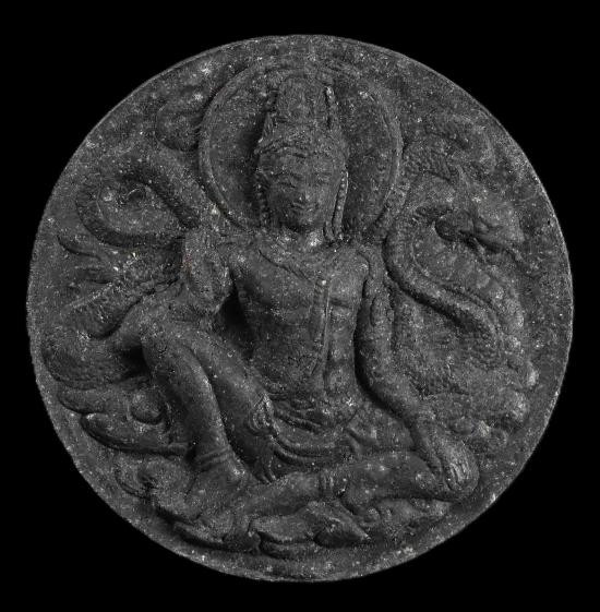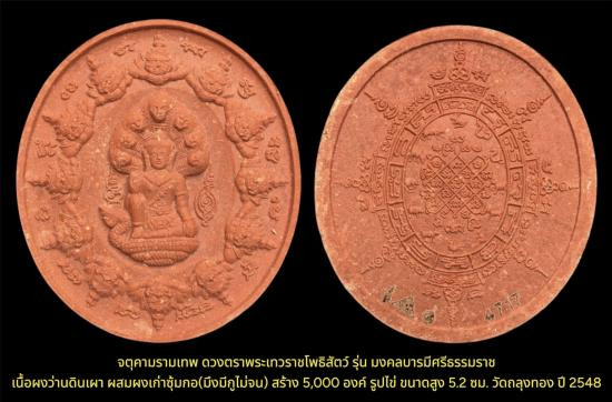 จตุคามรามเทพ ดวงตราพระเทวราชโพธิสัตว์ รุ่น มงคลบารมีศรีธรรมราช เนื้อผงว่านดินเผา ผสมผงเก่าซุ้มกอ(มึงมีกูไม่จน) สร้าง 5,000 องค์ รูปไข่ ขนาดสูง 5.2 ซม. วัดถลุงทอง ปี 2548